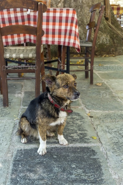 Молодая собака сидит на крупном плане каменной плитки