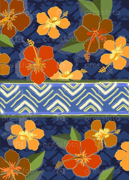 Фэнтези стилизованные цветы на синем фоне. Экзотические цветы с листьями и бордюрами