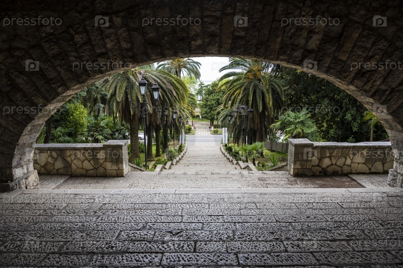 Вид на лестницу, пальмы и уличные фонари через арку из ресторана «Гагрипш» в городе Гагра в Республике Абхазия. Пасмурный день 11 мая 2021 г