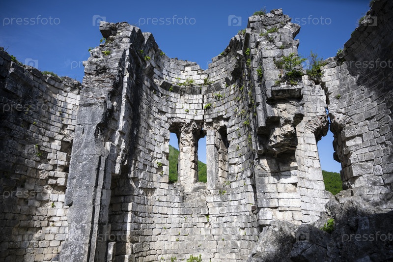 Древние руины Бзыбского храма в Республике Абхазия. Ясный солнечный день 13 мая 2021 г