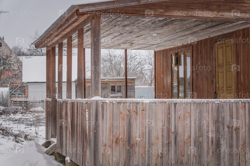 Недостроенный загородный дом зимой. Крупный план деревянной террасы