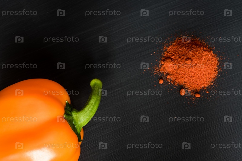 Оранжевый сладкий перец и порошок паприки на черном фоне, скопируйте место для текста