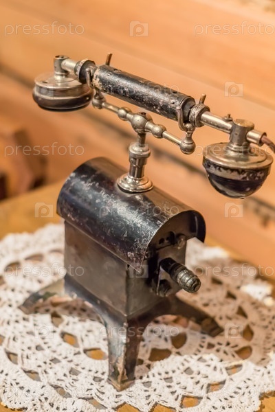 Винтажный ретро-телефон на деревянном столе, покрытом ажурной салфеткой
