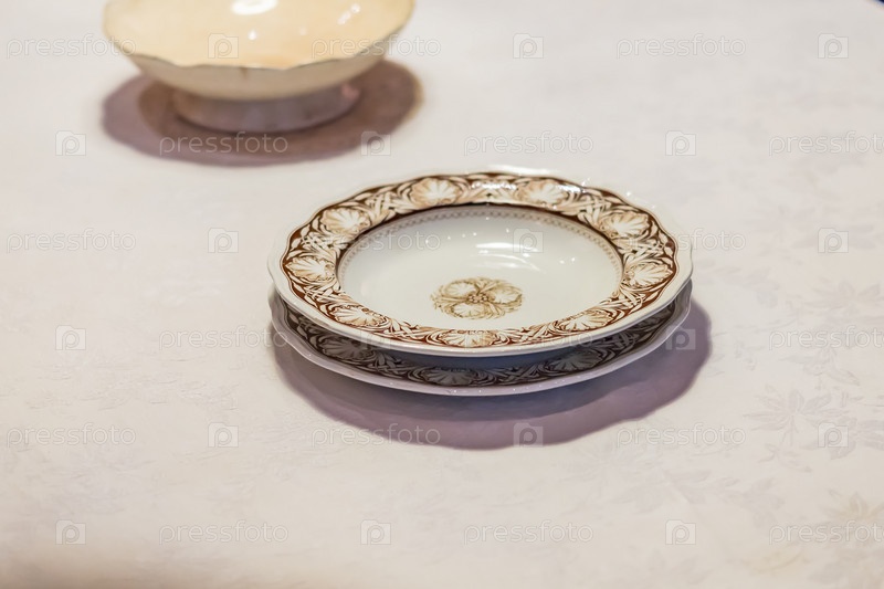 Две фарфоровые тарелки на белой скатерти