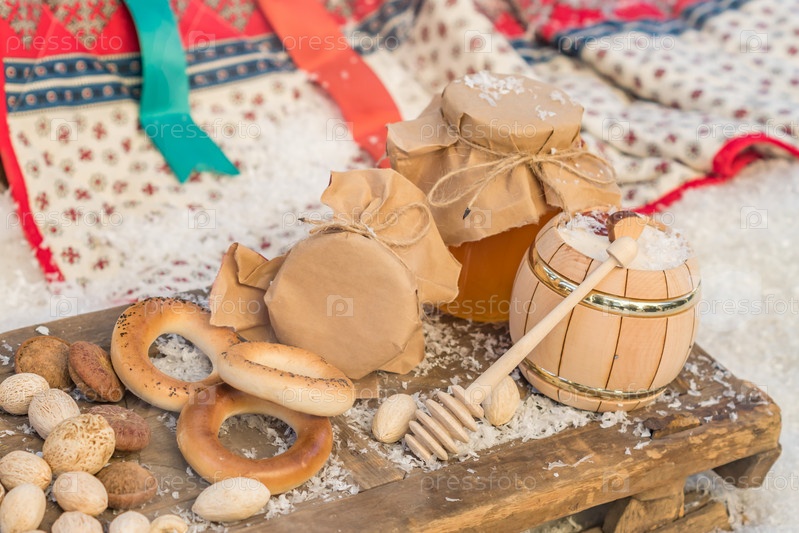 Натюрморт русских традиционных угощений - мед, орехи, рогалики на деревянных санях
