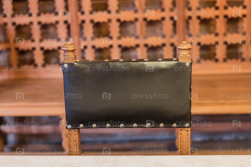 Черная кожаная спинка стула на резном деревянном фоне