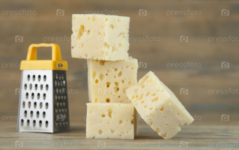 Кубики сыра с миниатюрной теркой на деревянном кухонном столе