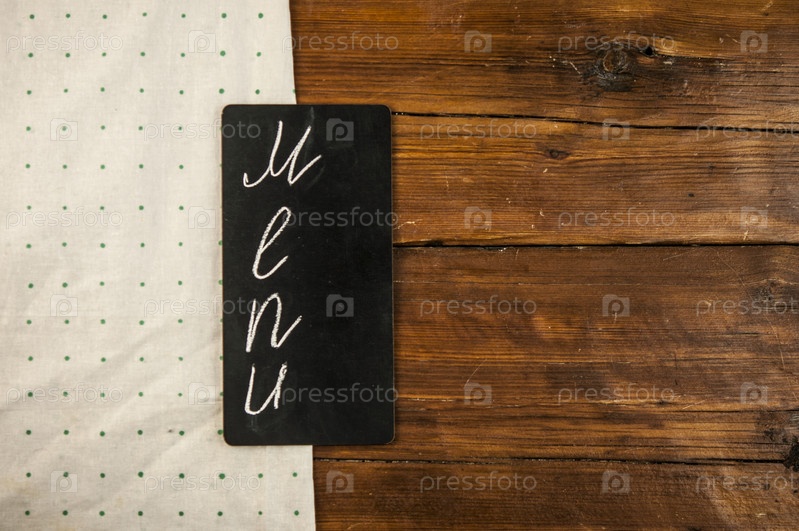 Меню написано мелом на старой доске с кухонной утварью на деревянном столе