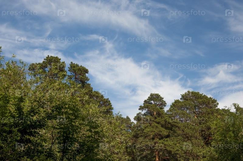 Небо с верхушками деревьев. Вид вверх с уровня земли. Голубое небо с солнцем и облаками
