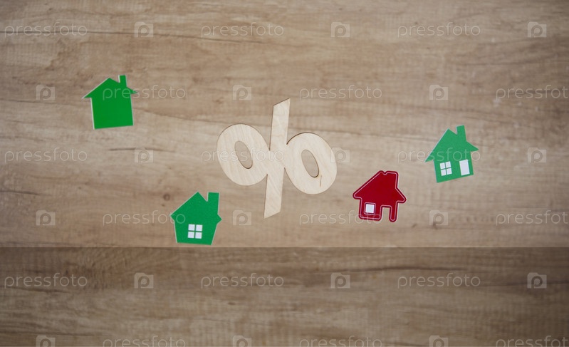 Миниатюрные дома висят по воздуху со знаком процента на деревянной стене. Недвижимость, концепция страхования, ипотека, покупка дома, концепция риэлтора