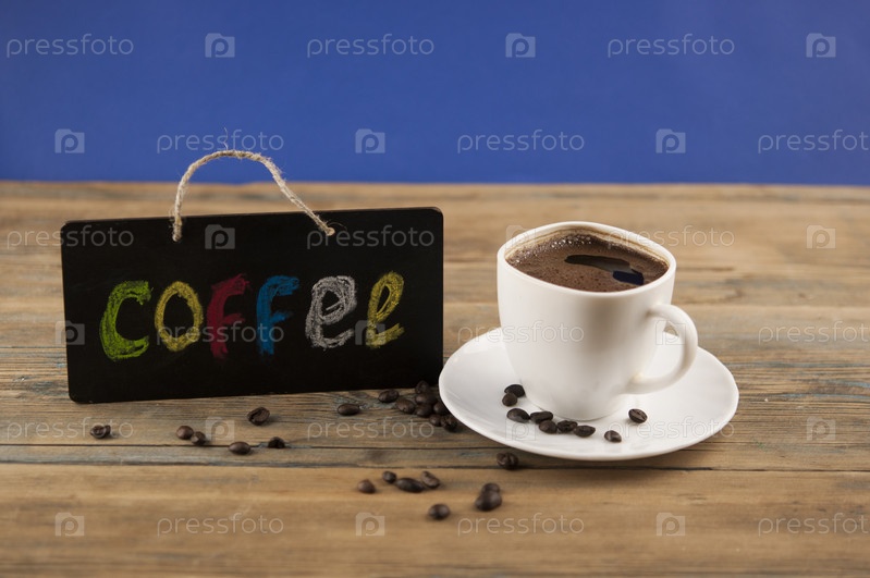 Чашка кофе и доска с надписью «кофе», написанная красочным алфавитом. Перерыв на кофе, концепция утреннего пробуждения