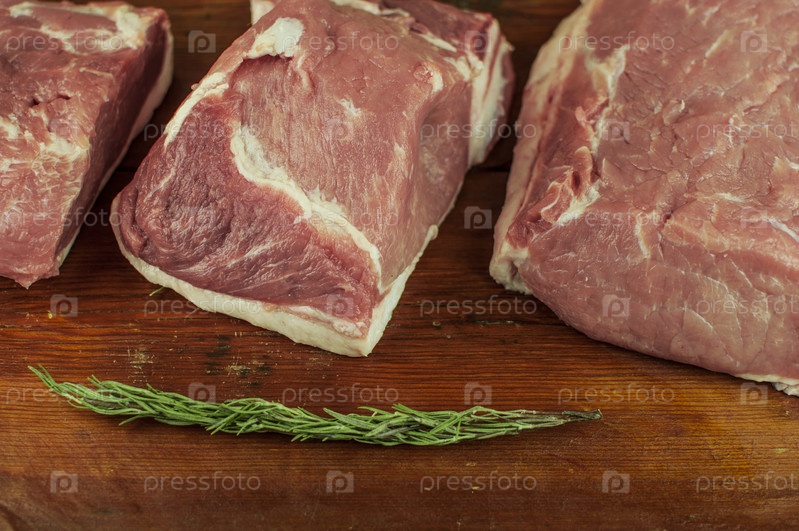 Кусок сырой свинины на деревянном столе. Свиная вырезка со специями и розмарином на деревянном фоне. крупный план, копирайт