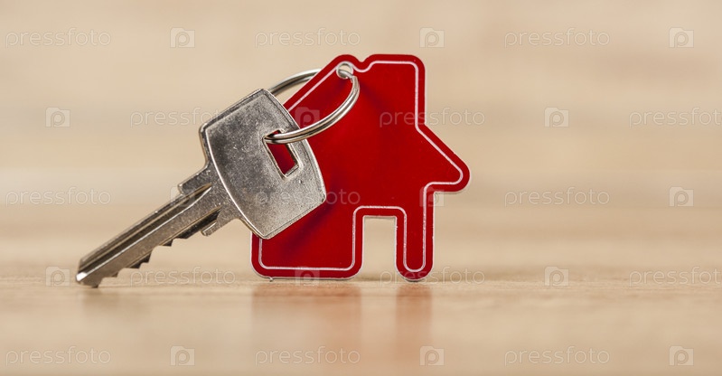 Расположение брелка в форме ключа и дома на деревянном фоне. Недвижимость, концепция страхования, ипотека, покупка дома, концепция риэлтора