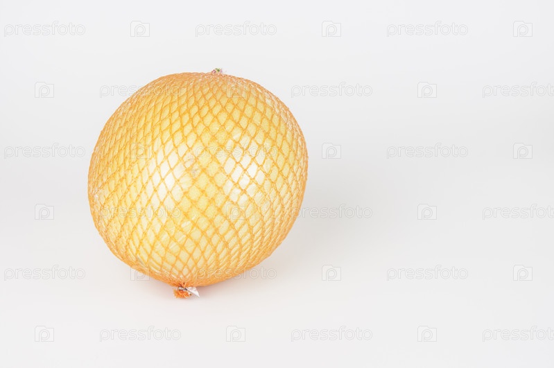 Спелый помело упакован в сетку на белом фоне