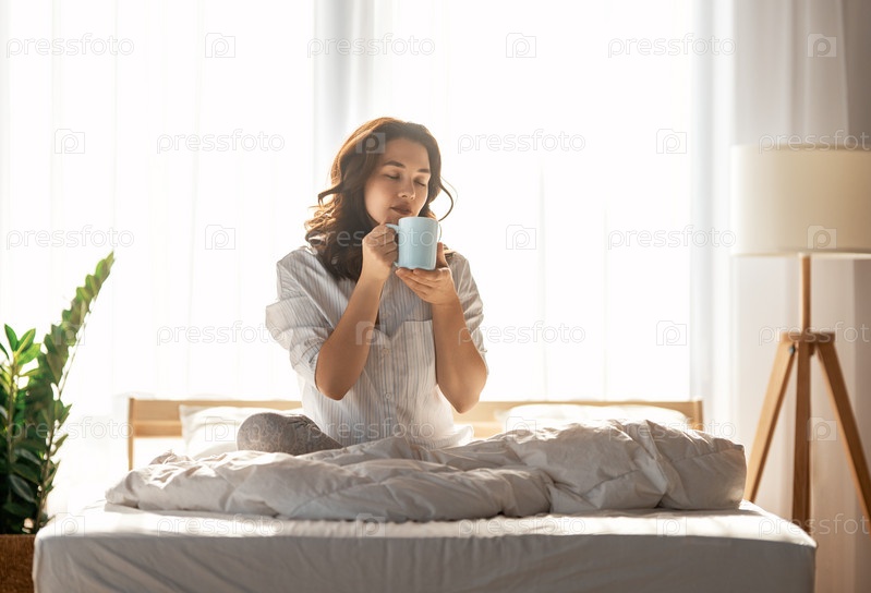 Женщина наслаждается солнечным утром и кофе