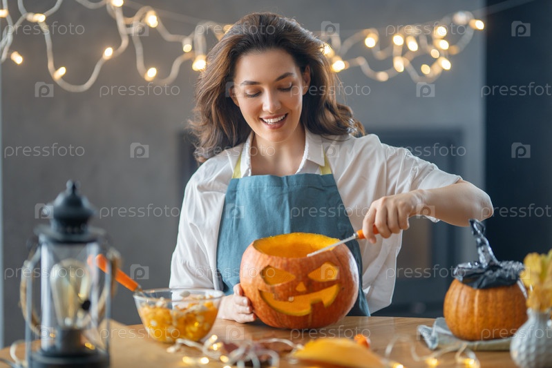 Женщина режет тыкву