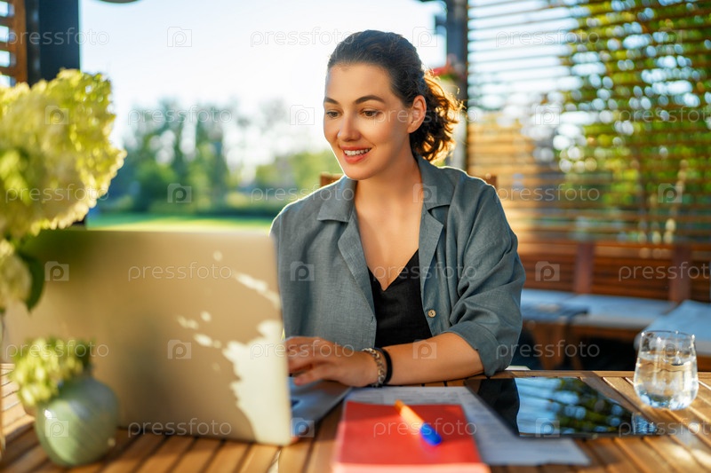 Женщина работает сидя во дворе