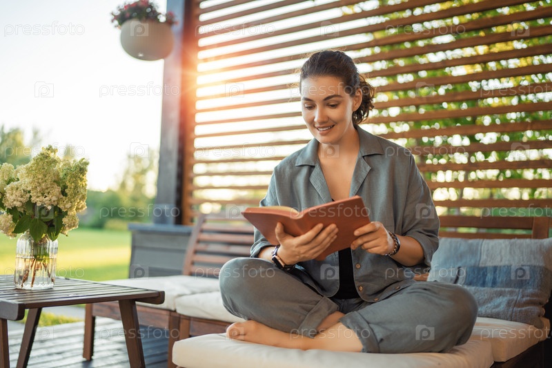 Женщина наслаждается книгой, сидя во внутреннем дворике