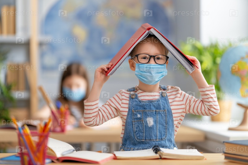 Дети в масках учатся в классе