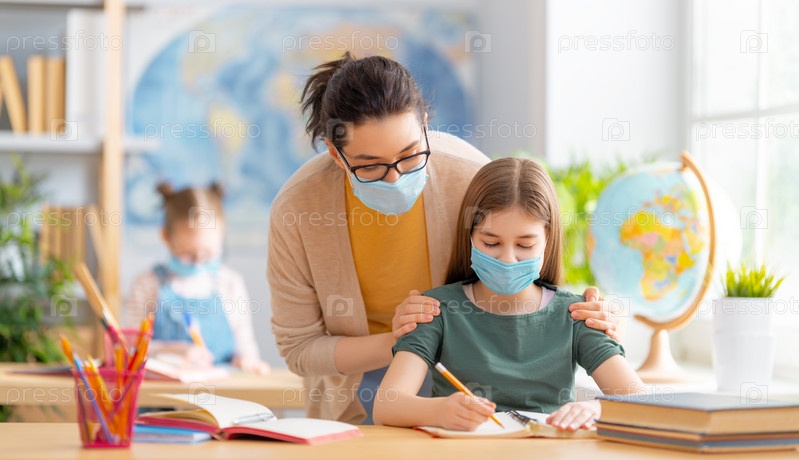 Дети в масках учатся в классе