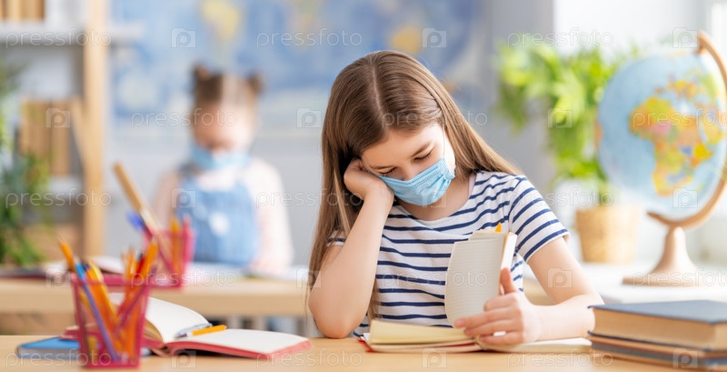 Дети в масках учатся в классе