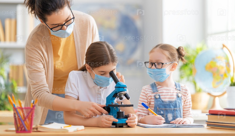 Дети в масках учатся в классе