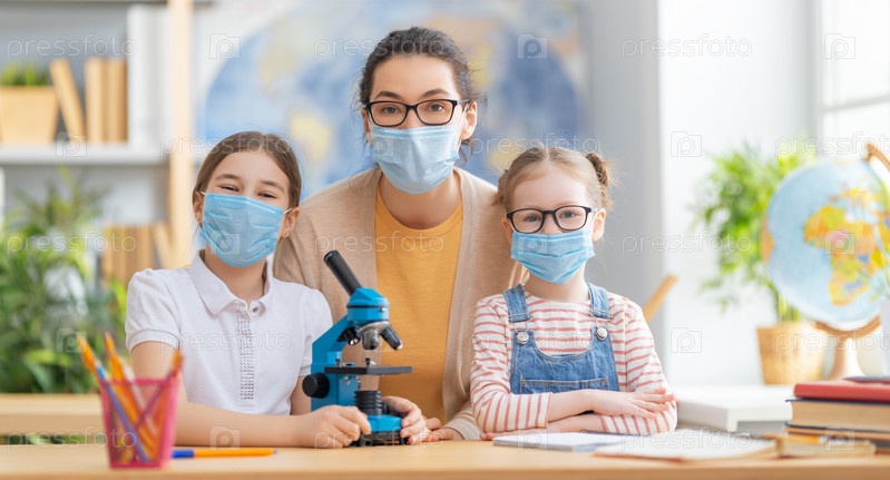 Дети в масках учатся в классе
