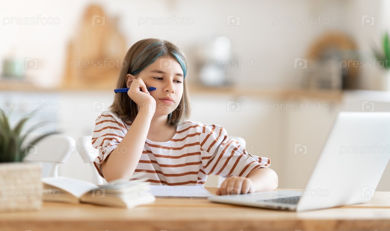 Девушка делает домашнее задание или онлайн-образование