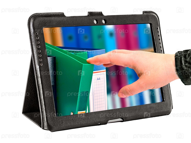 Планшет в кожаном чехле с папками на экране на белом фоне