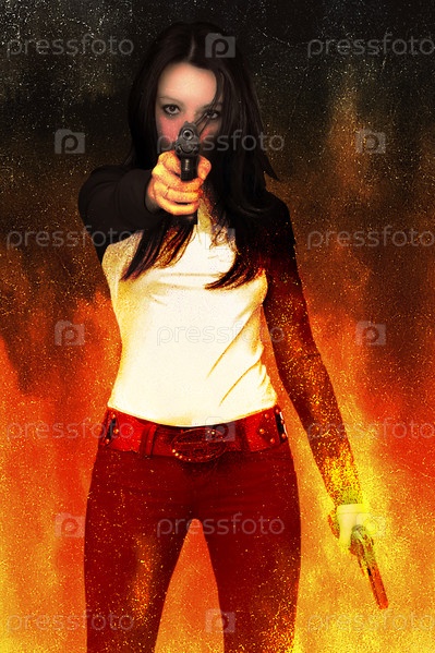 Девушка с двумя пистолетами на огненном фоне