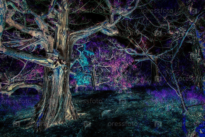 Иллюстрация. инопланетный нереальный лес на далекой неизвестной планете