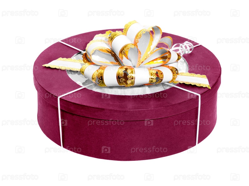 Круглая цветная подарочная коробка с бело-золотым бантом