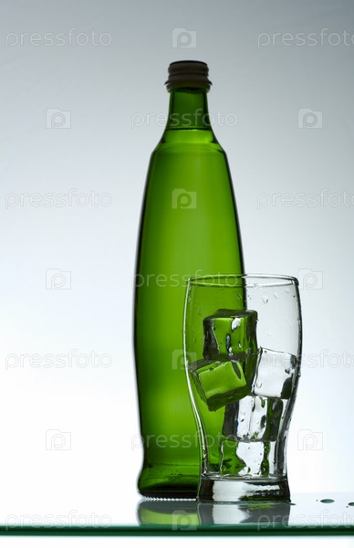 Бутылка воды и стакан со льдом на столе