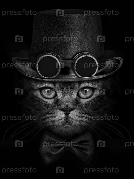 Темная морда кота в зеленой шляпе с консервными очками и галстуком-бабочкой