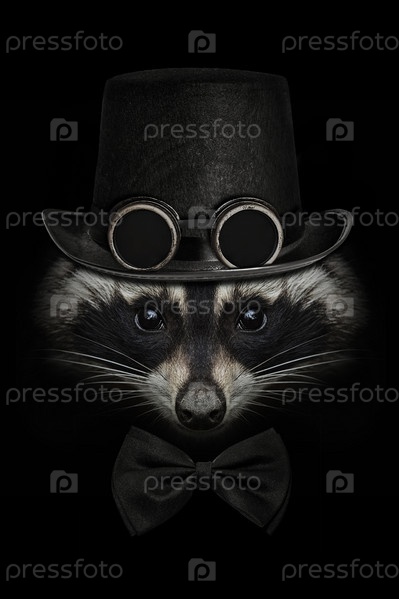 Лицо енота крупным планом на черном в шляпе с консервированными очками и галстуком-бабочкой