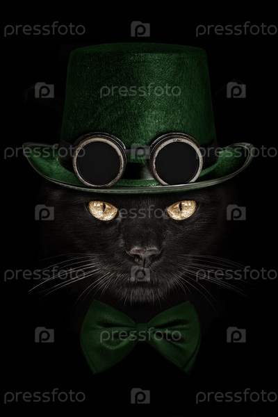 Темная морда кота в зеленой шляпе с консервными очками и галстуком-бабочкой
