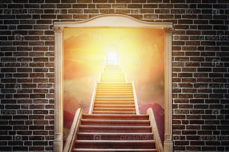 Лестница поднимается в белую двустворчатую дверь на старой кирпичной стене