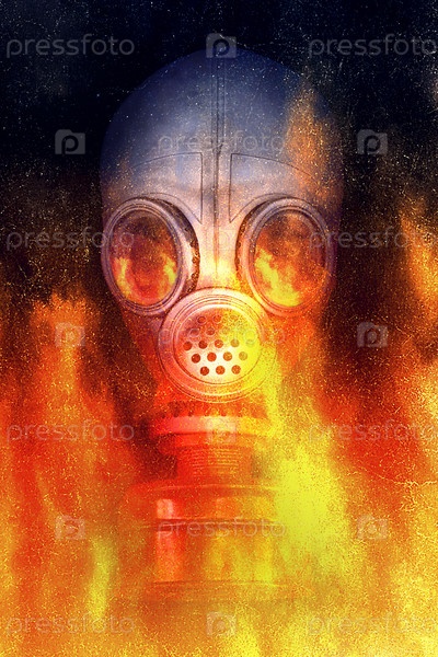 Человек в противогазе в пламени огня
