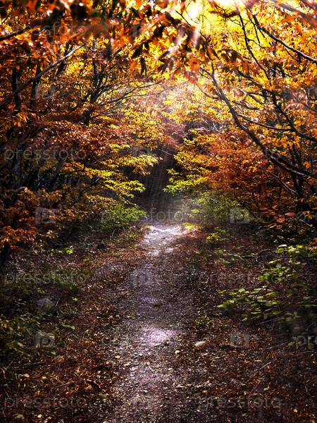 Тропинка в осеннем лесу, освещенная солнцем