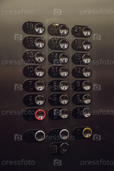 Кнопки этажа Лифт в многоквартирном жилом доме. Кнопки панели лифта крупным планом. Движение, транспортная концепция. Много кнопок на стене. Горит номер на панели управления лифтами
