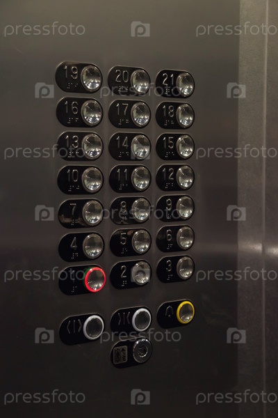 Кнопки этажа Лифт в многоквартирном жилом доме. Кнопки панели лифта крупным планом. Движение, транспортная концепция. Много кнопок на стене. Горит номер на панели управления лифтами