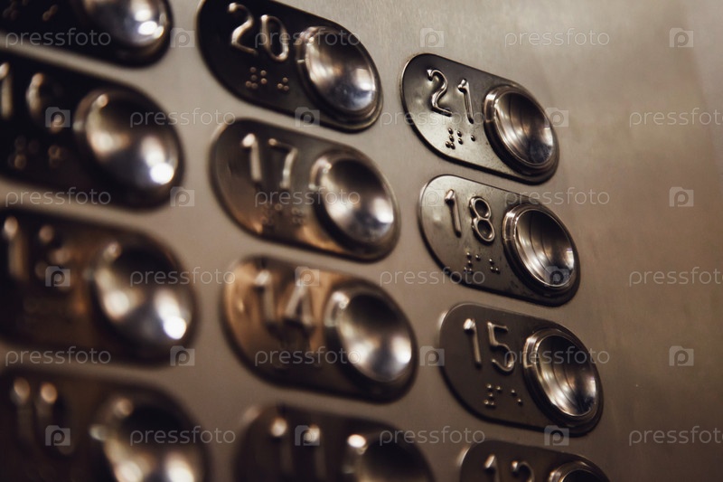 Кнопки этажа Лифт в многоквартирном жилом доме. Кнопки панели лифта крупным планом. Движение, транспортная концепция. Много кнопок на стене. Горит номер на панели управления лифтами