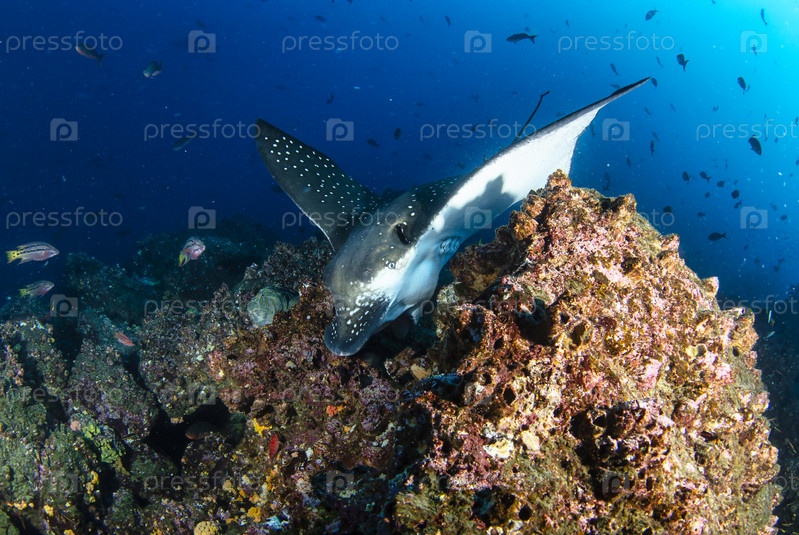 Черные пятнистые орлиные скаты плавают в тропических водах