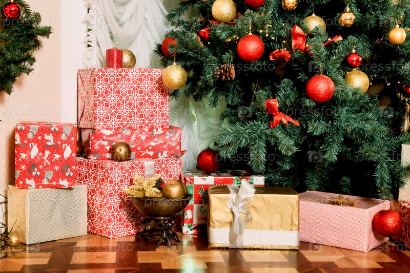 Крупным планом рождественский праздник фон украшенной елки с подарками