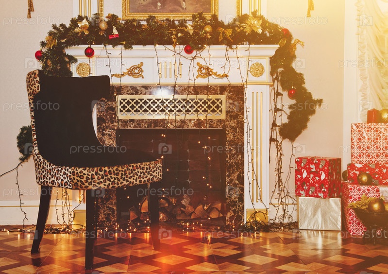 Рождественский праздник фон украшенного камина с елочными шарами