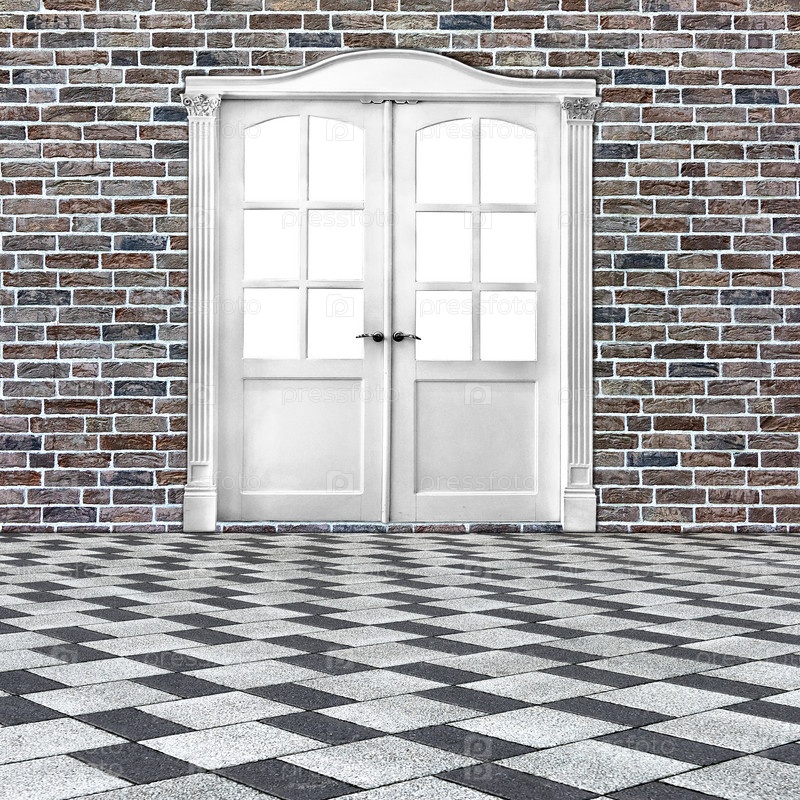 Белая двустворчатая дверь классического дизайна в старой кирпичной стене в стиле гранж