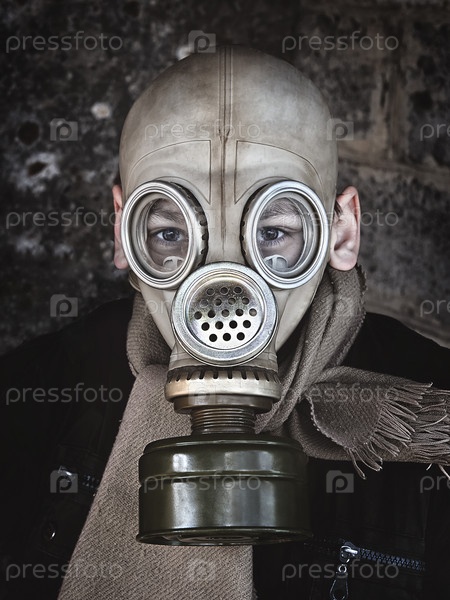 Мужчина в старом противогазе крупным планом