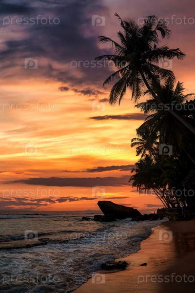 Фон тропический природный ландшафт с кокосовыми пальмами на фантастическом закате, удивительное оранжевое небо с облаками для концепции летних каникул и деловых поездок