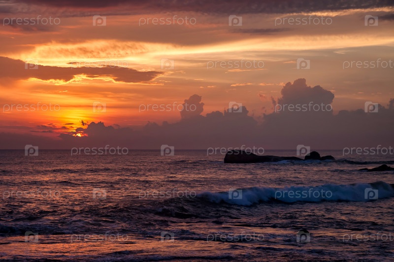 Фоновый тропический пейзаж природы с закатом на фантастическом морском пейзаже, удивительное небо на побережье океана (моря) для концепции летних каникул и деловых поездок
