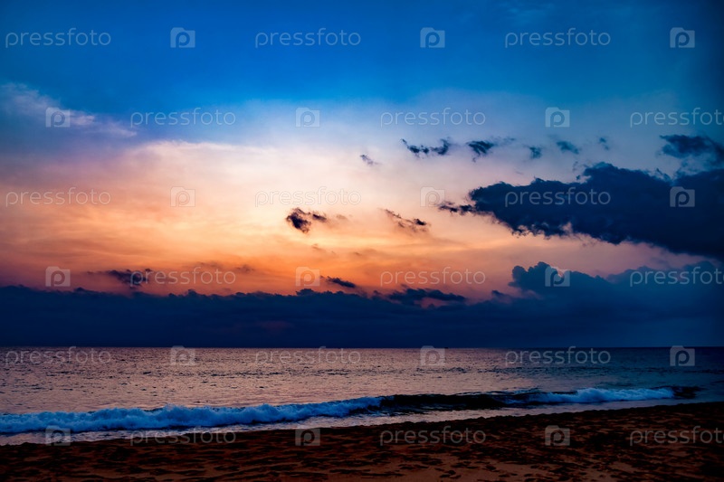Фоновый тропический пейзаж природы с закатом на фантастическом морском пейзаже, удивительное небо на побережье океана (моря) для концепции летних каникул и деловых поездок